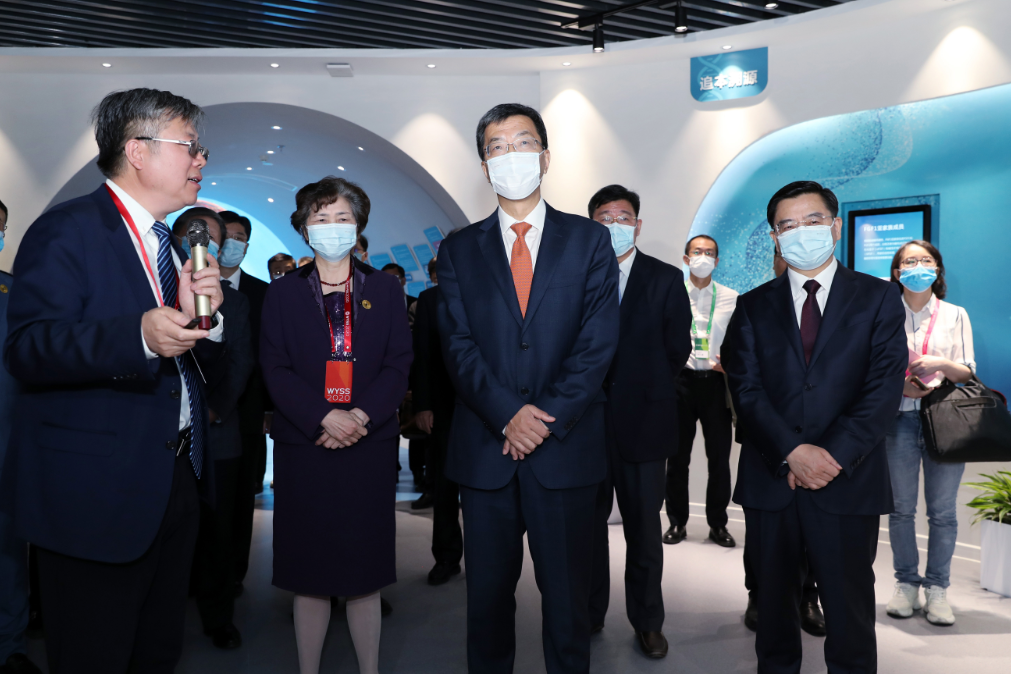中国科协主席怀进鹏,浙江省委常委、温州市委书记陈伟俊,以及李兰娟院士、樊代明院士等领导专家,参观生长因子科技之窗展馆。